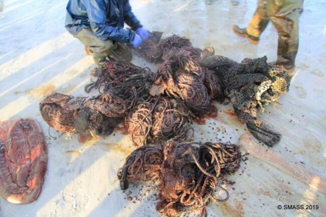 Dentro del estómago de la ballena encontraron redes de pesca, vasos y tubos de plástico. / SMASS 2019