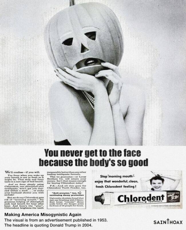 You never get to the face because the body is so good (nunca llegas a ver su cara porque su cuerpo es increíble). En el show de radio de Howard Stern en 2004, el magnate dijo esto en referencia al físico de la tenista Steffi Graf. Frase original del anuncio: Ninguna máscara de Halloween es más aterradora para los hombres que el mal aliento matutino.