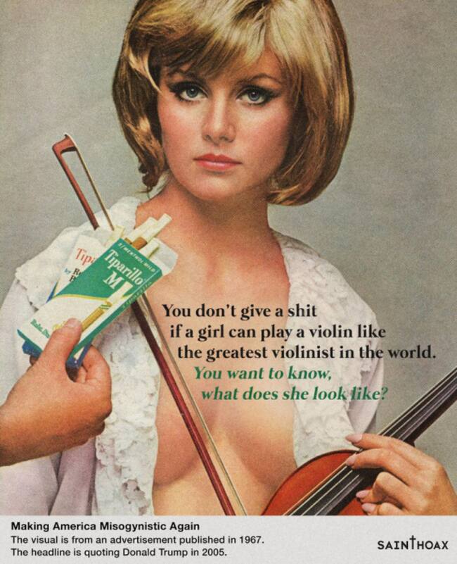 You don't give a shit if a girl can play violin like the greatest violinist in the world. You want to know, what does she look like? (Te importa una mierda si una chica puede tocar el violín como el mejor violonista del mundo. Lo que quieres saber es si es guapa). Este es un fragmento de una entrevista presentada en el libro TrumpNation, en referencia a los concursos de belleza. Frase original del anuncio: ¿Debe un caballero ofrecerle un Tiparillo (cigarro) a una violinista?