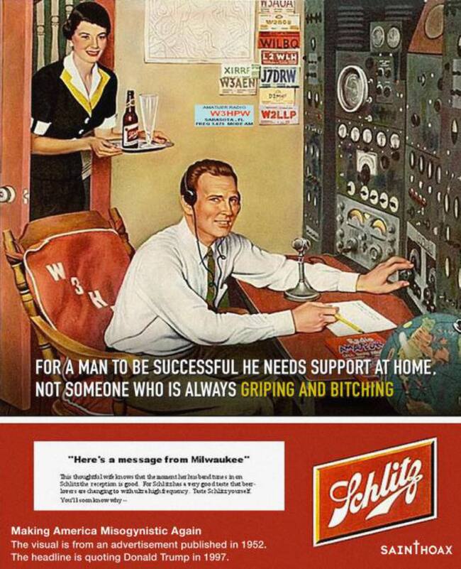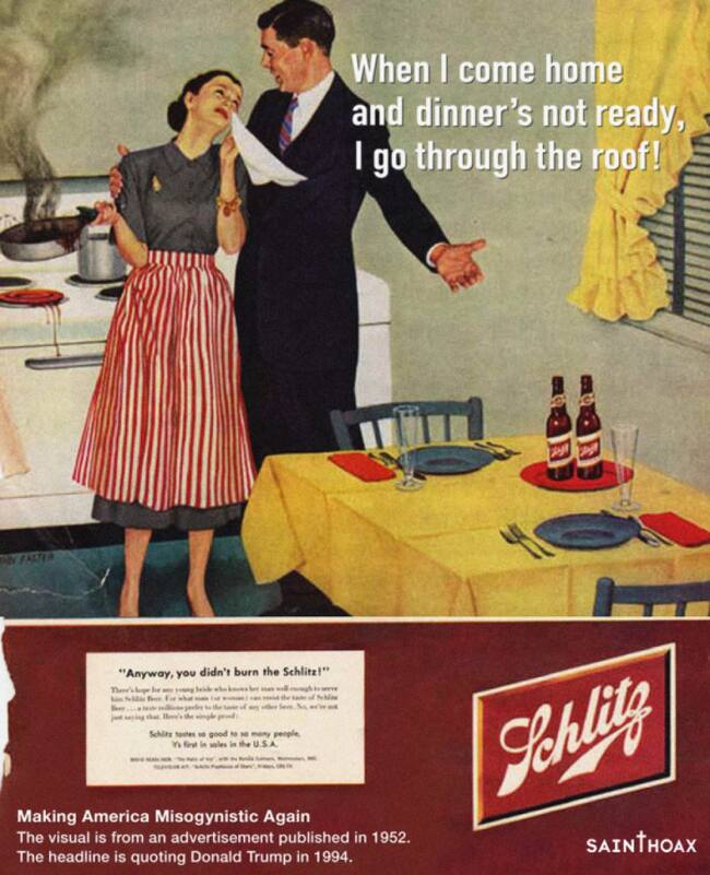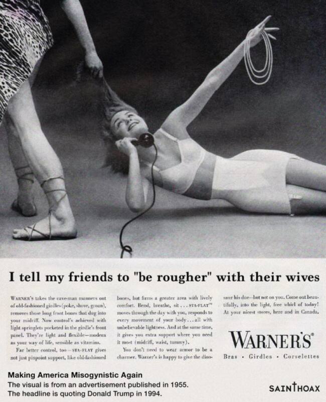 Women, you have to treat them like shit (mujeres, tienes que tratarlas de la mierda). Un amigo cercano de Trump le atribuyó esta frase al magnate en una entrevista con la revista New York en 1992. Frase original del anuncio: Es bueno tener a una chica en la casa.
