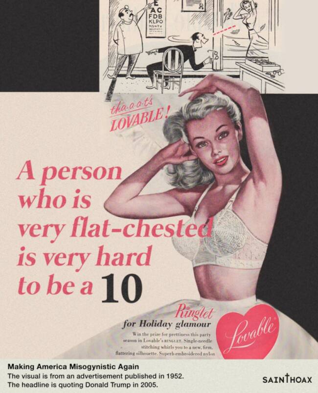 Must be a pretty picture, you dropping to your knees (debe ser una escena bonita, tú poniéndote de rodillas). El comentario fue para Brande Roderick, modelo y actriz que participó en la segunda temporada de Celebrity Apprentice, el reality de Trump. Durante una junta de consejo, Roderick dijo a Trump que ella se había arrodillado ante el líder de su equipo. Frase original del anuncio: Demuéstrale que este es un mundo de hombres.