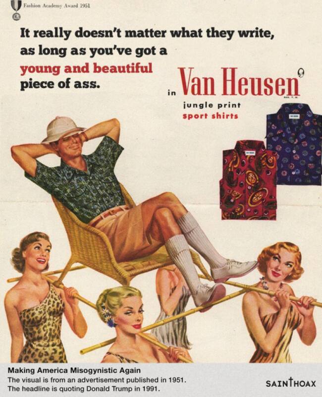 It doesn't really matter what they write, as long as you've got a young and beautiful piece of ass (no importa lo que digan, siempre y cuando tengas una pedazo de tía joven y guapa). La revista Esquire le preguntó su opinión sobre los artículos que hablaban del colapso de sus negocios en Atlantic City, eso fue lo que respondió. Frase original del anuncio: Hay que vivir como lo hacían los nativos.
