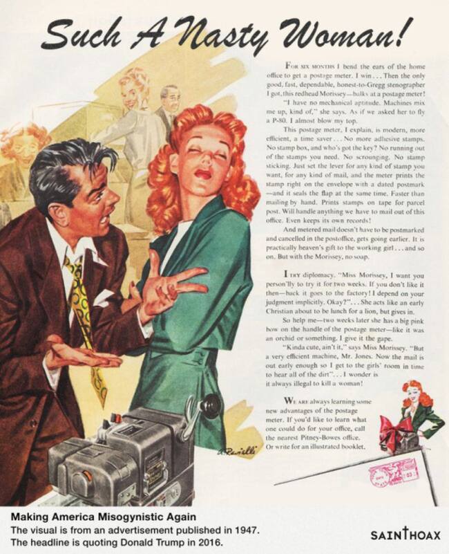 Such a nasty woman (una mujer tan desagradable). Así se refirió a Hillary Clinton durante el tercer debate presidencial en octubre de 2016, mientras ella hablaba de elevar impuestos a la población más rica. La frase fue una de las más notorias de la campaña presidencial y se usó como emblema durante la marcha de las mujeres en EE UU el pasado enero. Frase original del anuncio: ¿Siempre es ilegal matar a una mujer?