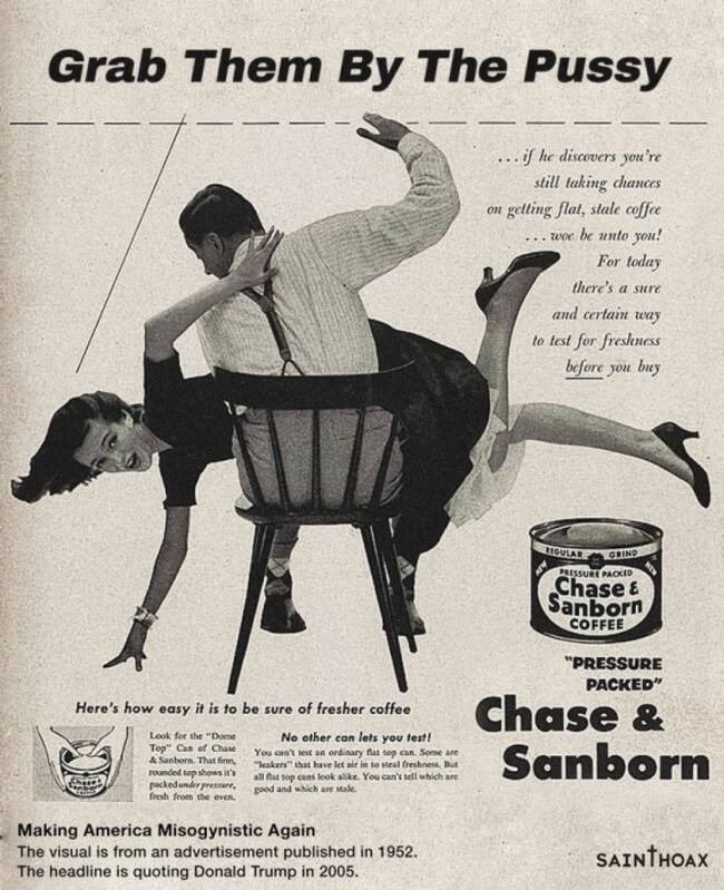 Grab them by the pussy (agárralas por la vagina). Trump dijo esto durante una conversación privada con el presentador Billy Bush en 2005. El Washington Post publicó una grabación de la plática durante la campaña presidencial, la cual causó polémica, pero no evitó la victoria del republicano. Frase original del anuncio: Si tu esposo se entera de que has cambiado de marca de café...