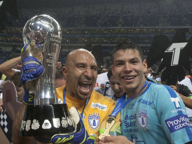 El portero mexicano Oscar Pérez tiene 43 años, los últimos 23 dedicados al futbol. En la imagen (izquierda) aparece celebrando el título que conquistó con Pachuca en mayo pasado. El "Conejo" es el jugador más veterano de la Liga MX