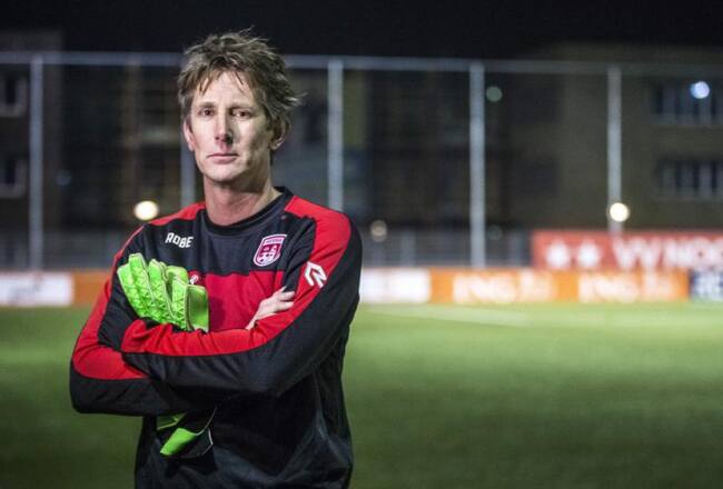 El portero holandés Edwin Van Der Sar de 45 años regresó del retiro para defender la meta del VV Noordwijk de la cuarta división de su país
