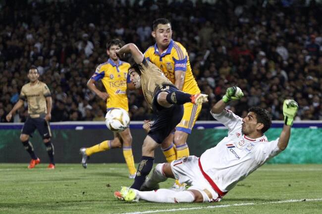 Matías Britos, de Pumas, gana el balón al portero Nahuel Guzmán, durante el partido de vuelta de la final del Apertura 2015