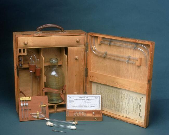 Transfusión de sangre. Las transfusiones de sangre de la época estaban lejos de ser una garantía de éxito, y se tenían que hacer en caliente, pero sistemas como este supusieron un avance excepcional en la medicina de campaña. / Foto: Science Museum.