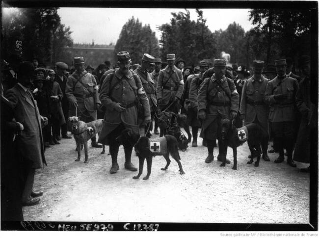 Perros de rescate. En la Primera Guerra Mundial los animales tuvieron mucho trabajo. Desde palomas para detectar gases hasta perros para atender a los heridos. / Foto: Bibliothèque Nationale de France.