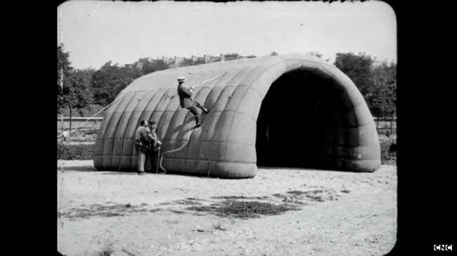 Hangar inflable. Se desarrollaron estructuras ingeniosas como esta hangar para dar cobijo a los aviones en cualquier lugar. / Foto: esmateria.com