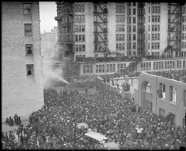 El Tanque. Los tanques fueron los grandes protagonistas en tierra. En la imagen, el Britannia muestra su potencia de fuego contra un edificio abandonado del MIT ante una multitud de bostonianos. / Foto: National Museum of American History.