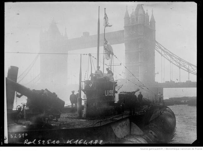 El terror de los mares. Los submarinos triunfaron en el Atlántico, sobre todo para que Alemania sembrara el terror entre sus enemigos. En la imagen, un submarino alemán capturado, en Londres. / Foto: Bibliothèque Nationale de France.