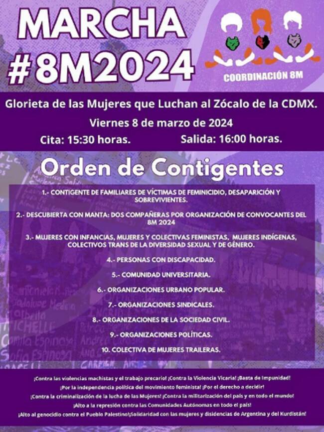 La Coordinación 8M México, perteneciente a diferentes Organizaciones Sindicales, Colectivas Feministas, Organizaciones Populares y Políticas, también se reunirán en la Glorieta de las Mujeres que Luchan, a las 15:30 horas, para salir a las 16:00 horas.