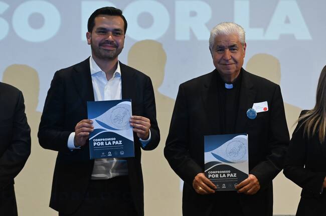 CIUDAD DE MÉXICO, 11MARZO2024.- El candidato de MC a la presidencia, Jorge Álvarez Maynez, firmó el Compromiso por la Paz luego de reunirse con integrantes de la Conferencia del Episcopado Mexicano, el cual encabeza Rogelio Cabrera. FOTO: DANIEL AUGUSTO/ CUARTOSCURO.COM