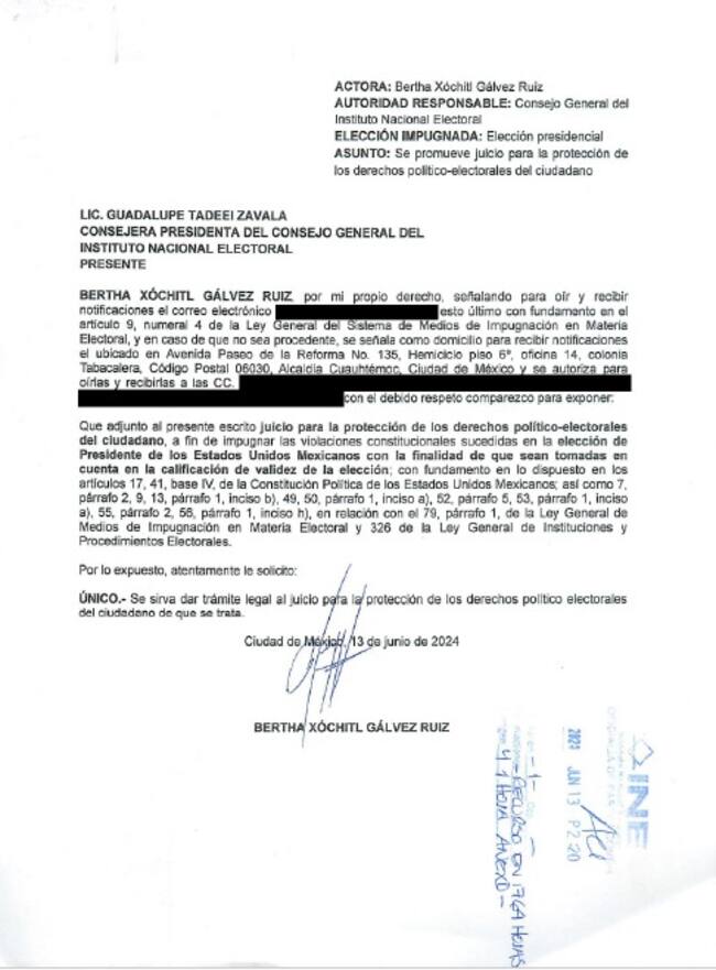 La excandidata a la Presidencia de la República del PRI, PAN y PRD, Xóchitl Gálvez Ruiz, presentó este jueves ante el INE una impugnación al proceso electoral para que se investigue y sancione la intervención del presidente Andrés Manuel López Obrador, así como la violencia e intervención del crimen organizado.