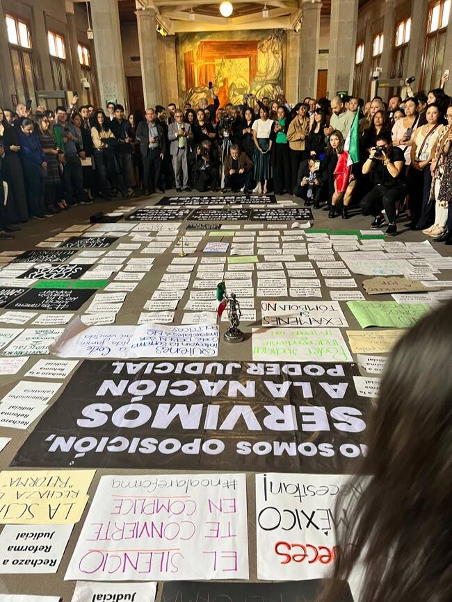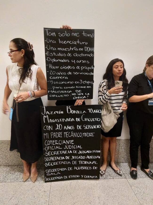 También realizaron pancartas con la consigna “SCJN rechaza la reforma al Poder Judicial”, “el control morenista de la ley no existe”, “tenemos tres poderes, el Judicial es el que nos protege”, “Todos somos PJF”, “el juez imparcial es de carrera judicial”.