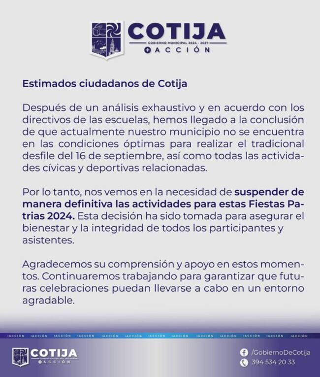El Gobierno de Cotija publicó en redes sociales el municipio no se encuentra en condiciones óptimas para continuar con los festejos patrios.