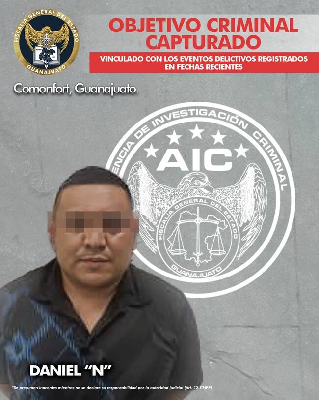 Con la captura de Daniel “N”, la Fiscalía de Guanajuato esclarece los homicidios registrados en fechas recientes como el de Carlos Augusto “N” e intento de asesinato de Gilberto Zarate Jr. en la comunidad de Empalme Escobedo, el 02 de septiembre de 2024.