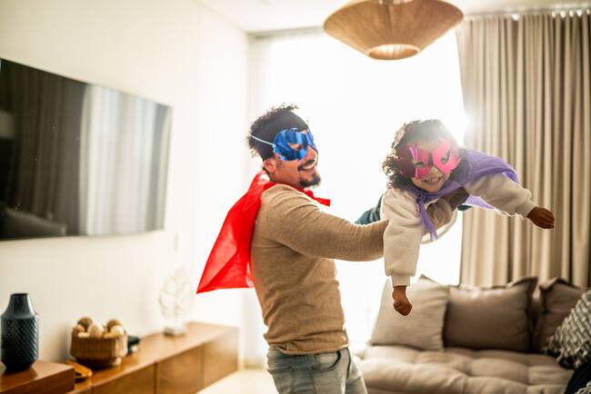 Father and daughter playing superhero in the living room at home / FG Trade Latin