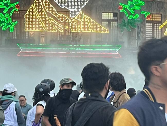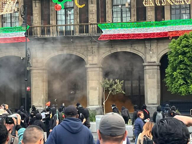 18:00 horas: Integrantes del llamado bloque negro le prenden fuego a una puerta del Gobierno central, lanzan piedras y petardos.