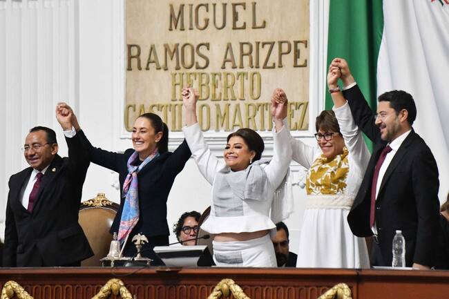 CIUDAD DE MÉXICO, 05OCTUBRE2024.- Clara Brugada, tomó protesta como Jefa de Gobierno de la Ciudad de México, durante la sesión solemne del Congreso capitalino. La acompañan: Rafael Guerra Álvarez, presidente del Tribunal Superior de Justicia de la Ciudad de México; Claudia Sheinbaum, presidenta de México; Martha Ávila, diputada presidenta de la Mesa Directiva, y Martí Batres, jefe de Gobierno saliente. FOTO: MARIO JASSO/CUARTOSCURO.COM