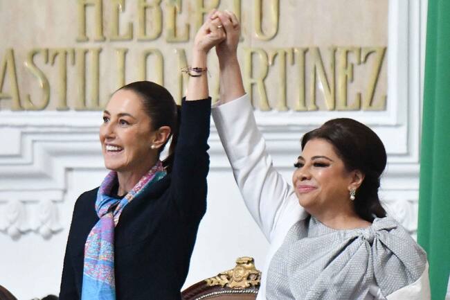 CIUDAD DE MÉXICO, 05OCTUBRE2024.- Clara Brugada, tomó protesta como Jefa de Gobierno de la Ciudad de México, durante la sesión solemne del Congreso capitalino. La acompaña:Claudia Sheinbaum, presidenta de México. FOTO: MARIO JASSO/CUARTOSCURO.COM
