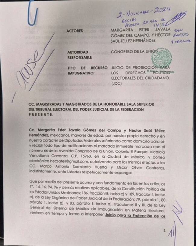 Margarita Zavala y Héctor Saúl Téllez, presentaron la impugnación correspondiente enfatizando que el ejercicio careció de criterios de formación públicos, transparentes y equitativos, sin la participación de legisladores de San Lázaro y a nombre de su Grupo Parlamentario.