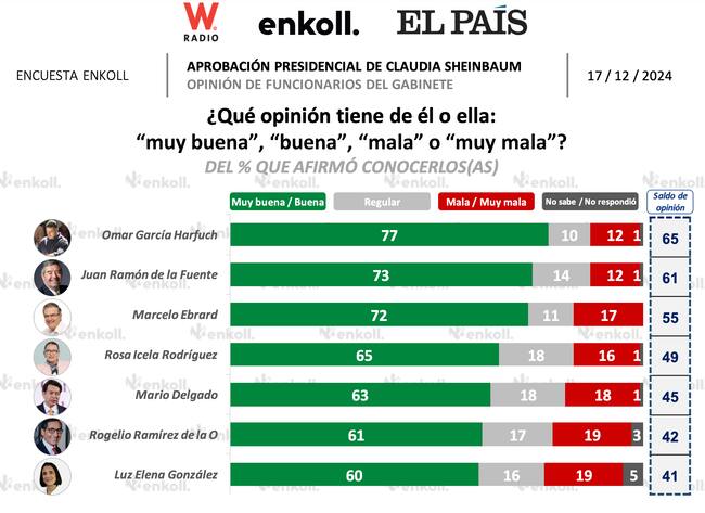 Cabe destacar que en materia de aprobación positiva, Omar García Harfuch es quien tiene mejor opinión positiva, seguido por Juan Ramón de la Fuente, Marcelo Ebrard, Rosa Icela Rodríguez, Mario Delgado, Rogelio Ramírez de la O y Luz Elena González.