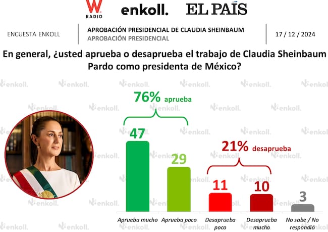 En la encuesta se puede apreciar que la Presidenta inicia con un alto nivel de aprobación, pues a dos meses de haber tomado protesta cuenta con 76% de aprobación y 21% de desaprobación.