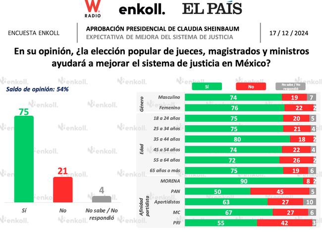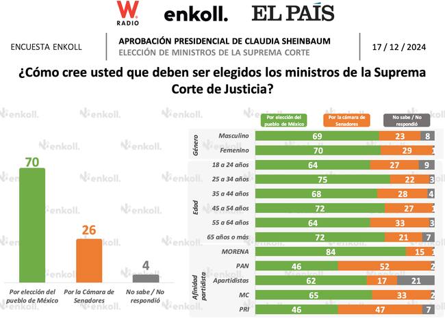 En la encuesta de Enkoll, también se abordó el tema de la elección de Ministros, donde los encuestados dijeron estar a favor de la elección por el pueblo mexicano con un 70 por ciento y por la Cámara de Senadores 26 por ciento.