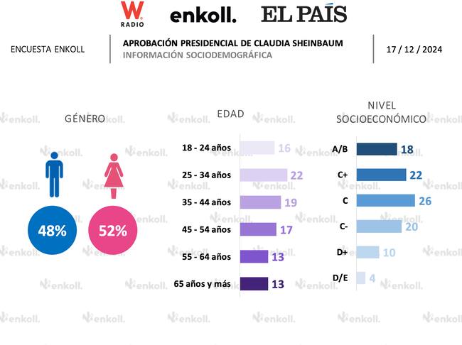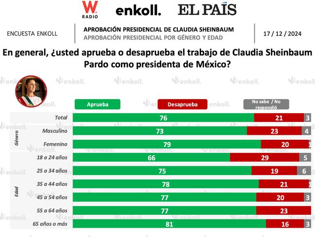 Como se puede apreciar, la presidenta, Claudia Sheinbaum tiene un alto nivel de aprobación desde la mayoría de las perspectivas, especialmente por el sexo femenino. En el caso de Andrés Manuel López Obrador, éste contaba con la mayor aprobación de parte del sexo masculino, de acuerdo con Enkoll, encuestadora que además destacó durante las elecciones presidenciales por los asertivos resultados de sus comparativas.