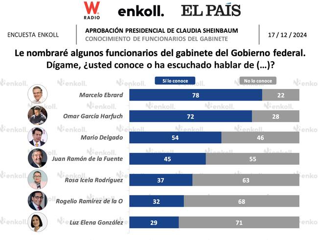 Como se puede apreciar se trata de un gabinete bastante conocido, ya que en comparación con gabinetes como por ejemplo el de el expresidente, Enrique peña Nieto a mitad del sexenio, Luis Videgaray Caso y otros contaban sólo con el 25 por ciento de aprobación, lo mismo con los integrantes del gabinete de Felipe Calderón, “si alguno quería ser presidenciable, no llegaba al 30 por ciento de aprobación”, puntualizó Heidi Osuna.