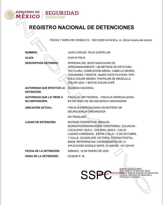 Tras su detención “El Chavo Félix” fue trasladado bajo un fuerte dispositivo de seguridad a la Ciudad de México, donde quedará a disposición de las autoridades federales.