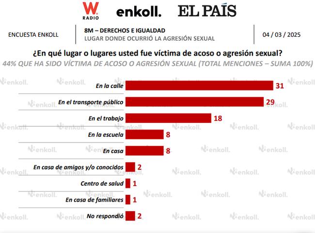 Al ser cuestionadas respecto a si han sido víctimas de acoso sexual, el 44% respondió que sí, que representa una disminución del 0.4% respecto al 2024. El lugar donde más reciben este tipo de agresión es en la calle, seguido por el transporte público.