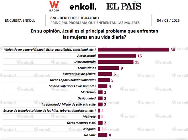 En ella se refleja que el 30% de las encuestadas consideran que el principal problema al que se enfrentan las mujeres en México es la violencia en general, que engloba la sexual, física, psicológica, emocional, etcétera. El segundo problema es el acoso sexual.