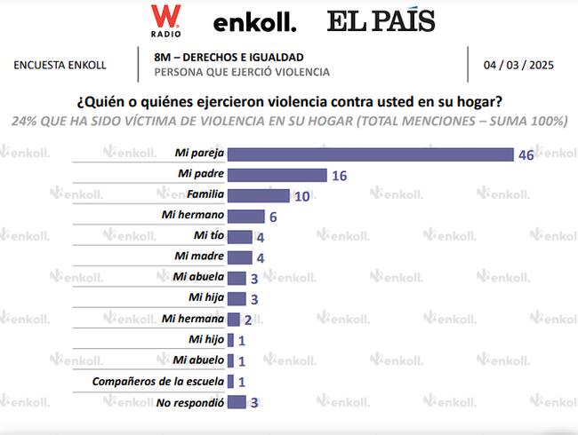 La encuesta de Enkoll para W Radio y El País revela que de las mujeres que han sufrido de violencia en el hogar, el 31% de los casos la persona agresora es la pareja