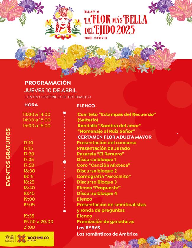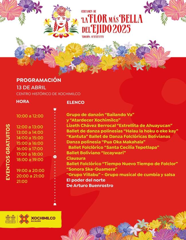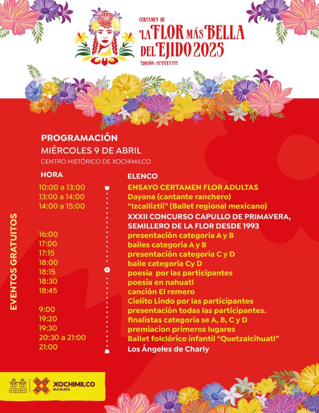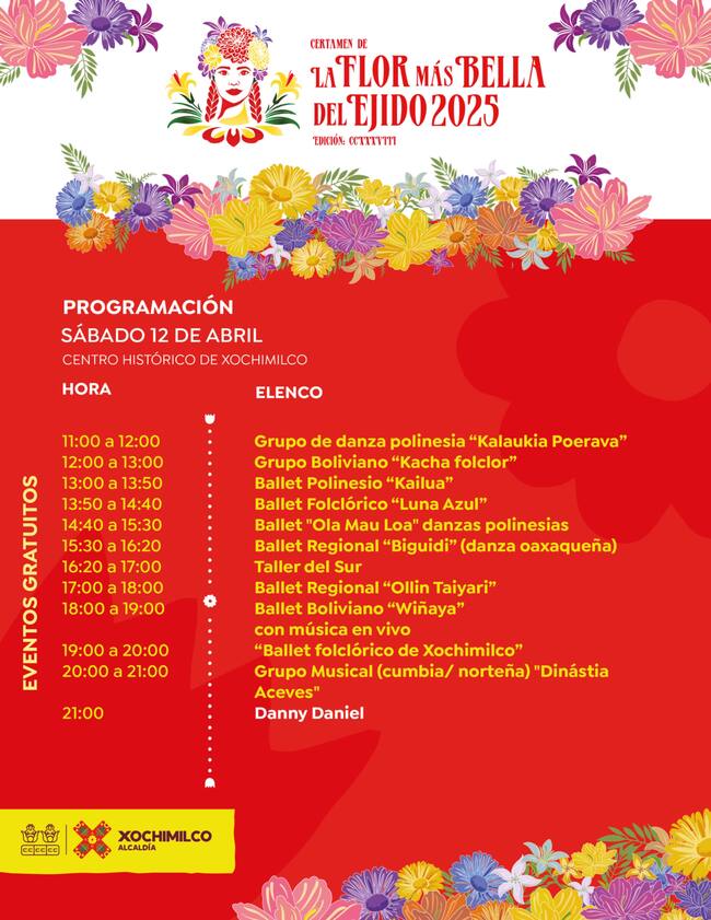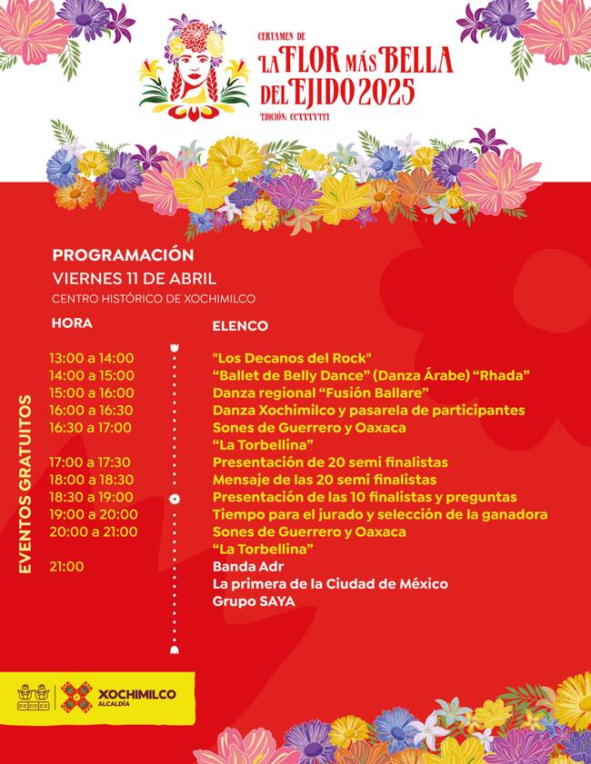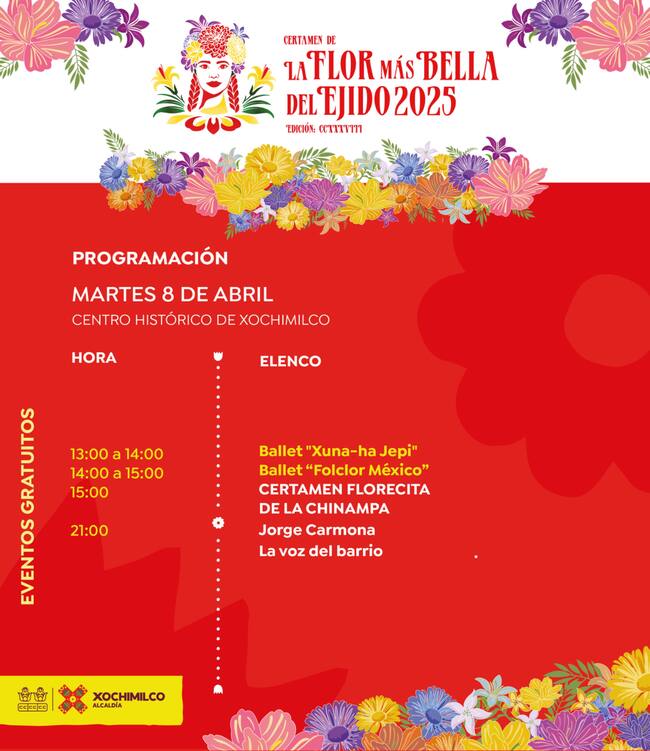 Asimismo, se implementarán iniciativas para reducir el impacto ambiental, promoviendo el uso de materiales biodegradables y campañas de concientización ecológica. Se espera la asistencia por lo menos 50 mil personas durante toda la semana de actividades, con un impacto positivo en la economía local al impulsar a productores, comerciantes y artesanos de la región. Para más información sobre la programación y actividades de La Flor Más Bella del Ejido 2025, la Alcaldía Xochimilco invita a seguir sus redes sociales oficiales.