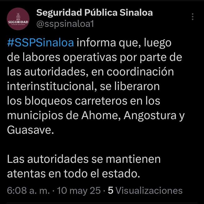 Esta mañana la Secretaría de Seguridad Pública de Sinaloa informó que, tras labores operativas por parte de las autoridades, se liberaron los bloqueos carreteros en Ahome, Angostura y Guasave.