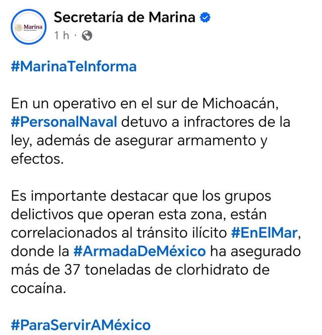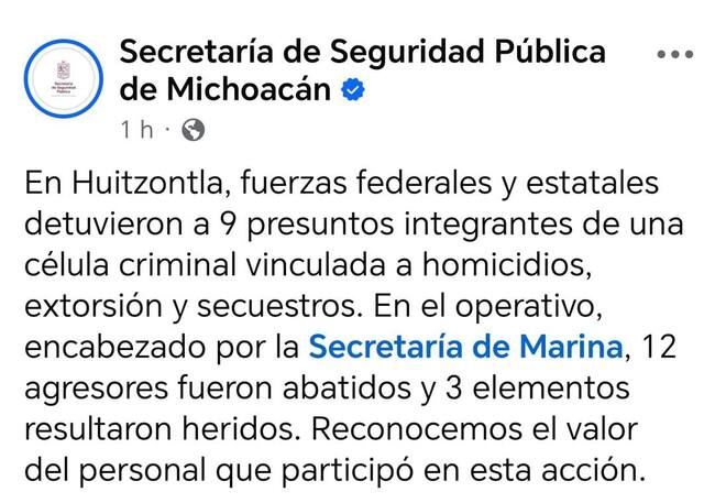 Las autoridades detallaron que la célula criminal estaría relacionada con los delitos de homicidio, extorsión y privación ilegal de la libertad; la operación encabezada por la Secretaría de Marina, contó con apoyo de elementos de la Defensa, la Guardia Nacional, la Secretaría de Seguridad y Protección Ciudadana (SSPC), la Fiscalía General de la República (FGR) y, por parte del Gobierno de Michoacán, con personal de la Policía y la Fiscalía del Estado.