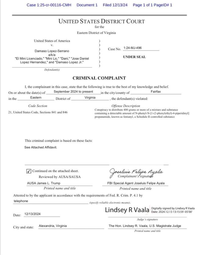 Dámaso López Serrano, alias “El Mini Lic”, socio del Cartel de Sinaloa, firmó un acuerdo de culpabilidad ante la corte federal de Virginia, en Estados Unidos. El caso está a cargo de la juez Lindsey R. Vaala.