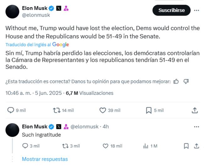 Pero ahí no quedó todo, Musk declaró la guerra diciendo que Donald Trump no hubiera llegado a la presidencia sin él. “Que ingratitud”, posteó el CEO de Tesla.