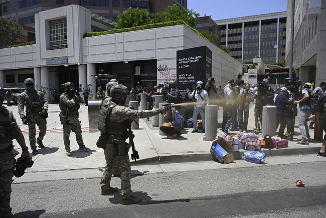 La Guardia Nacional junto con elementos policiacos buscan la liberación de la autopista 101 que permanece bloqueada por manifestantes que exigen el cese de las redadas migrantes. / Anadolu