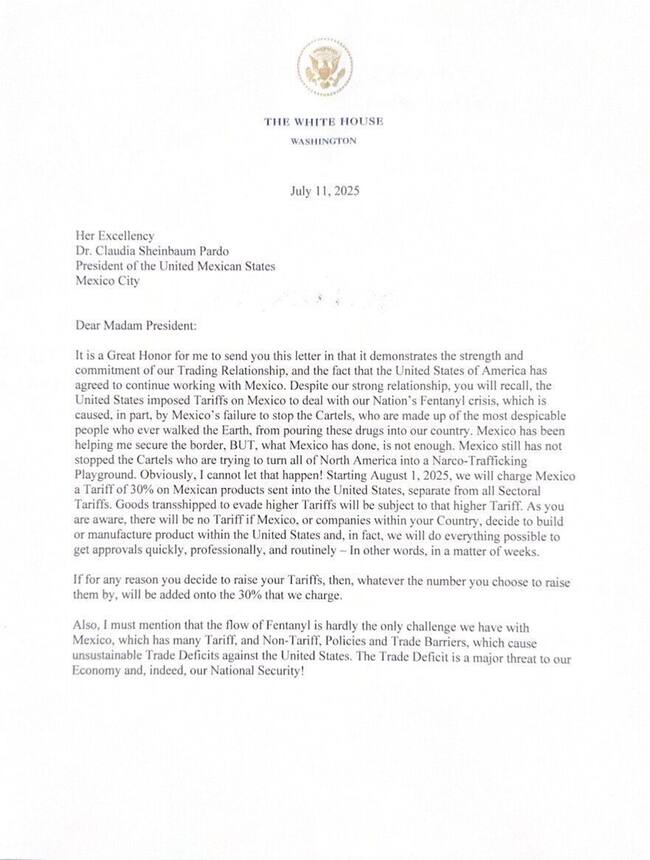 Por medio de una carta, Trump asegura que el arancel entrará en vigor a partir del 1 de agosto