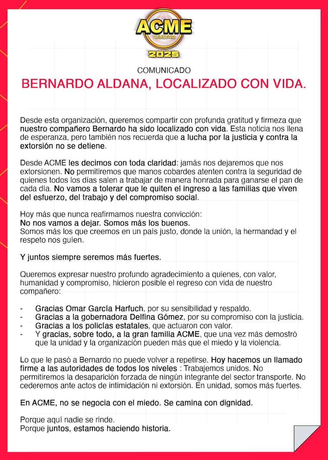 La agrupación agradeció a las autoridades y declaró que en "ACME no se negocia con el miedo. Se camina con dignidad"