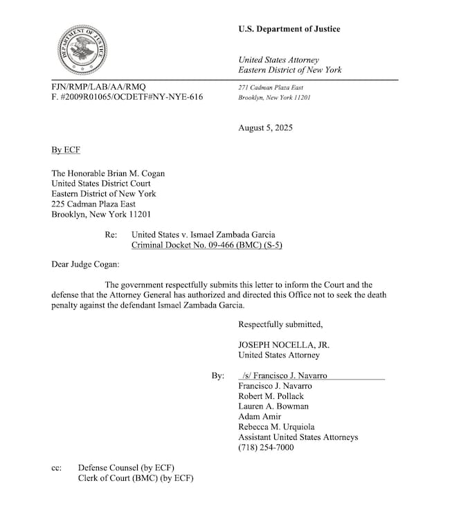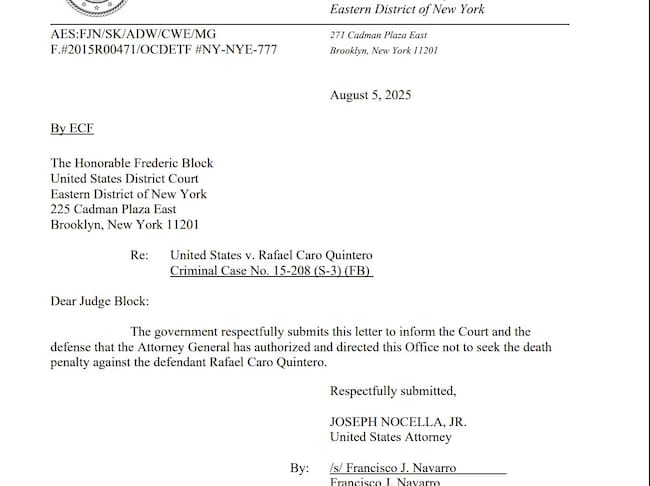 “El Gobierno presenta respetuosamente esta carta para informar a la Corte y a la defensa que la Fiscal General ha autorizado y ordenado a esta Oficina no solicitar la pena de muerte contra el acusado Ismael Zambada García”