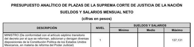 La SCJN informó que cada ministro recibirá 137 mil 131 pesos mensuales netos, además de 287 mil 591 pesos anuales por aguinaldo, prima vacacional y asignaciones adicionales.