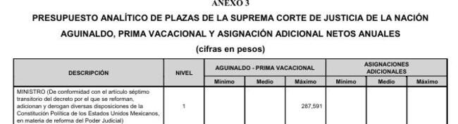 Además, las ministras y ministros que iniciaron funciones el 1 de septiembre tendrán derecho a 287 mil 591 pesos netos anuales por concepto de aguinaldo, prima vacacional y asignaciones adicionales.