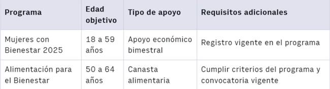 Las mujeres registradas en la Pensión del Bienestar y que que se encuentren entre los 50 y 59 años y cumplan con los criterios específicos de ambos programas tendrán la oportunidad de recibir tanto el apoyo económico como el alimentario.