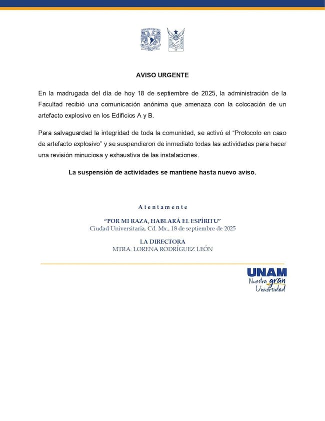 La amenaza de explosivo fue dirigida en específico a los Edificios A y B de la Facultad de Economía.