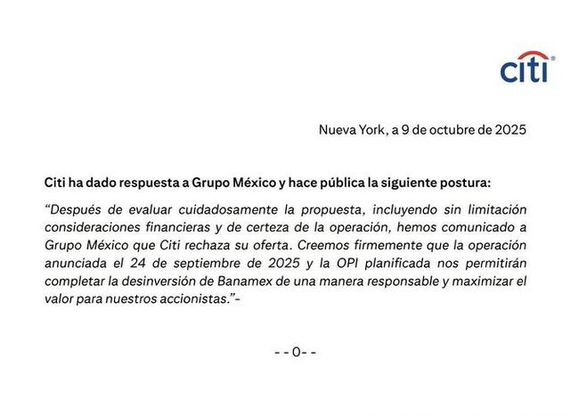 Después de evaluar cuidadosamente la propuesta, incluyendo sin limitación consideraciones financieras y de certidumbre de la operación, hemos comunicado a Grupo México que Citi rechaza su oferta"